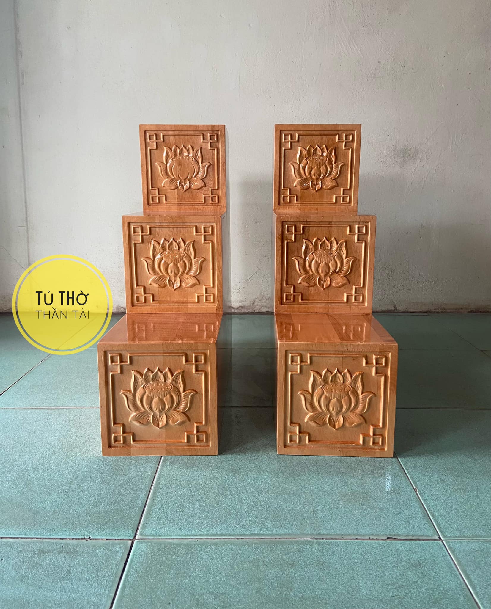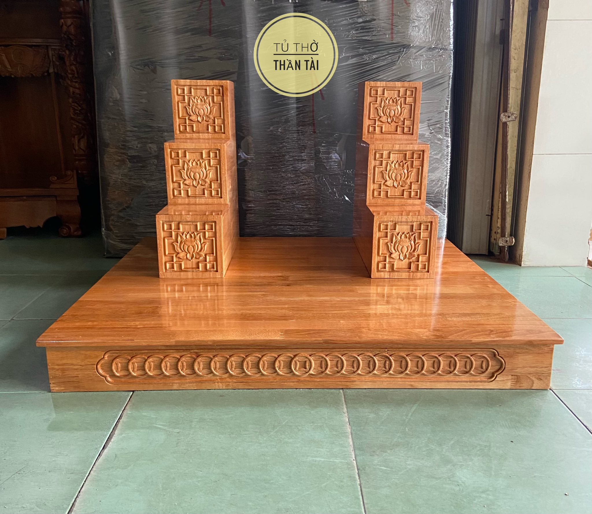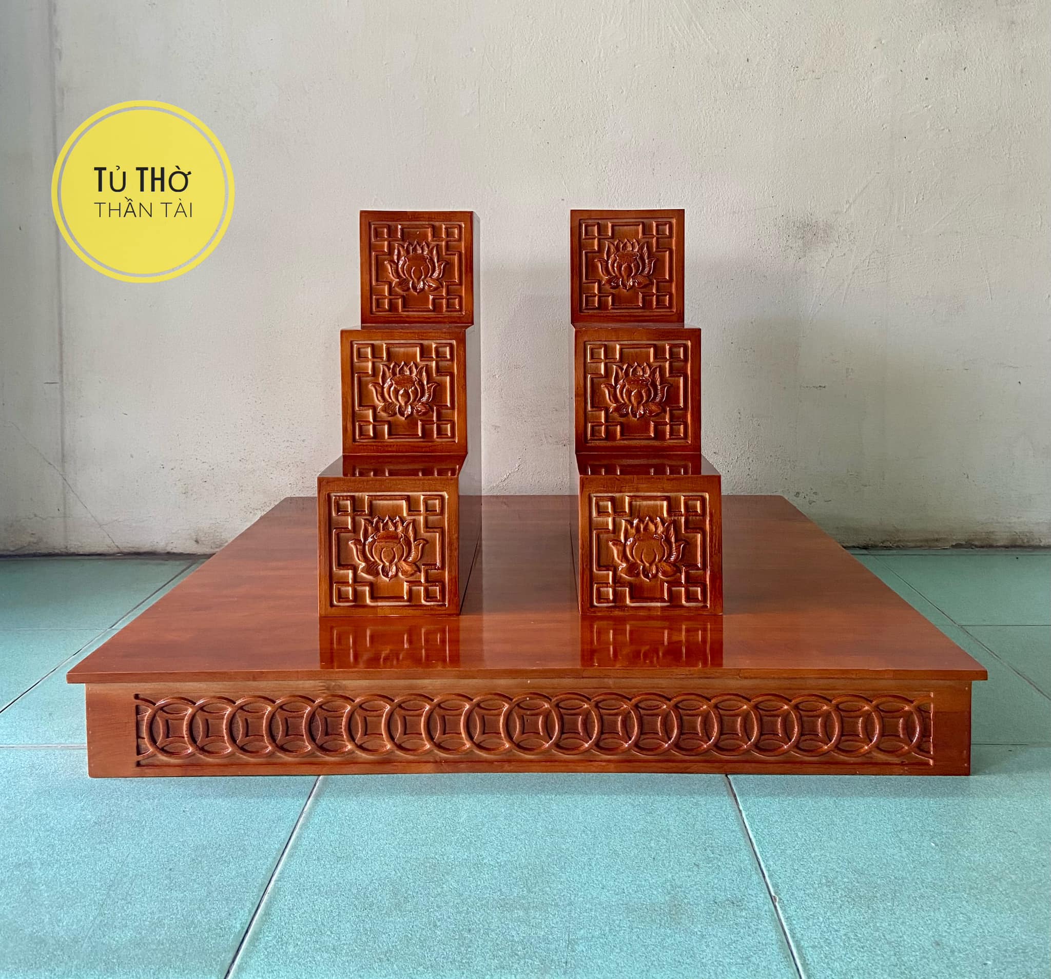 Bục tam cấp bàn thờ thần tài khắc Hoa Sen ( Hàng loại 1 dày dặn và cứng cáp )