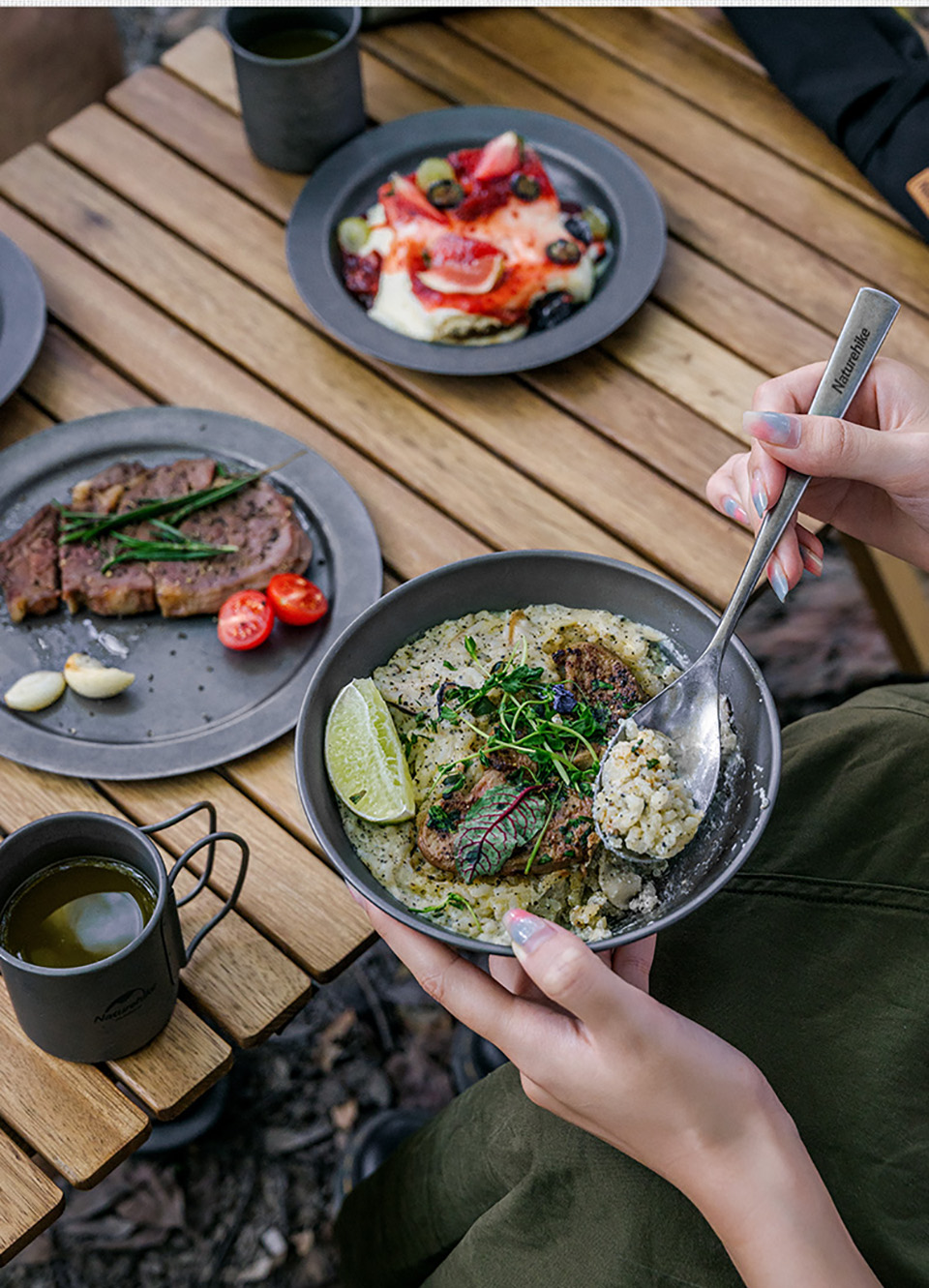 Bộ dao muỗng nĩa dã ngoại Naturehike NH21SJ003 được thiết kế theo một phong cách "rất cũ" (Archaic Dinnerware) với điểm nhấn về độ dày và sự chắc chắn, cùng với đó là sự xưa cũ được thể hiện rõ trên bề mặt sản phẩm với phần vân xước tự nhiên, đem lại một cảm giác "ngày xưa", một chút cổ điển cho chuyến đi của bạn.