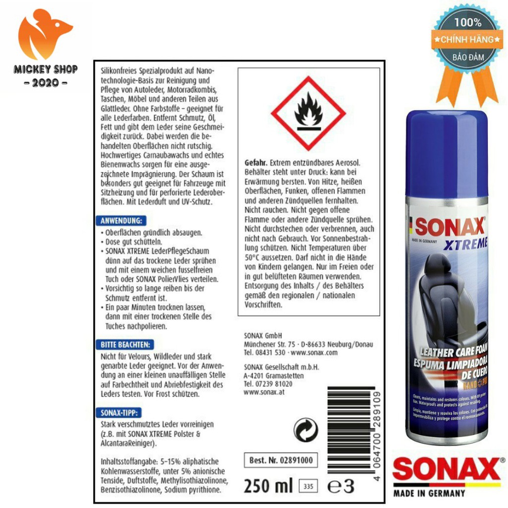 Mickey 2020 Shop xin giới thiệu sản phẩm Chai Xịt Bảo Dưỡng Da Dạng Bọt Công Nghệ Nano Sonax Xtreme Leather Care Foam Nano Pro 289100 làm sạch và chăm sóc da dựa trên công nghệ nano, để loại bỏ bụi bẩn, dầu mỡ và chăm sóc da như ghế xe, phụ kiện nội thất, da xe máy, đồ nội thất và các thành phần khác được làm từ da mịn. Không chứa thuốc nhuộm và dùng được cho mọi màu da.