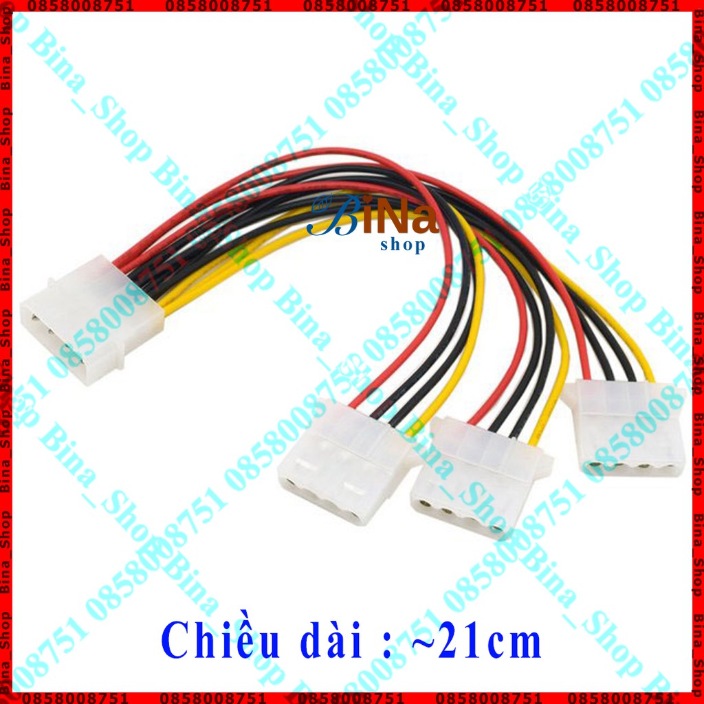 - Kích thước dây : 20AWG - Màu dây : đỏ, đen, vàng - Nhiệt độ chịu đựng : 80°C - Điện áp chịu đựng : 300V - Chiều dài : ~21cm - Trọng lượng : 16g - Chia nguồn IDE Molex từ 1 thành 3 để nối dài hoặc cấp nguồn đồng thời 3 thiết bị cùng lúc: Fan, ổ đĩa...