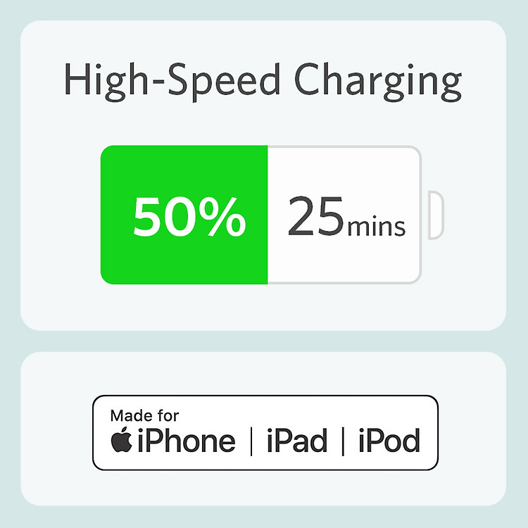 Sẵn sàng sạc nhanh: Tương thích với sạc nhanh Power Delivery để sạc iPhone, iPad hoặc bất kỳ thiết bị Lightning nào khác của bạn ở tốc độ tối đa có thể. Lưu ý: Yêu cầu bộ sạc tốc độ cao Power Delivery tương thích.