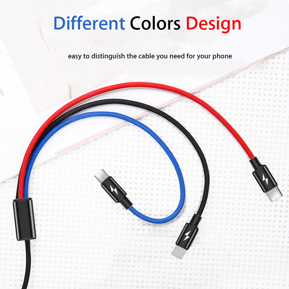 Product Type: Data Cable Type: All in one Compatible brands: Blackberry, LG, Palm, Toshiba, Samsung, Panasonic, Apple iPhone, HTC, Nokia, Sony, Motorola Features: reversible, three in one Type: Three-in-one USB cable Function: Apple / Micro USB / C USB charging cable Technology: Fast charging cable Material: durable fishing line braided + alloy metal Length: total length 200CM, main line: 170CM, branch line: 30CM; Output current: 3 ports maximum output 3.5A / single port maximum output 2A Compatible: suitable for IOS 9 10 11 & Android and USB TYPE C cable Function 1: Fast charging cable/fast charger cable Function 2: Mobile phone line Function 2: Three-color distinction, easier to distinguish Package Included: 1 * 3 in 1 cable