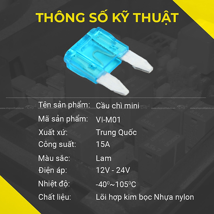 Cầu chì mini VI-M01 15A được làm bằng hợp kim kẽm và nhựa theo tiêu chuẩn và điện áp định mức, sử dụng phù hợp cho nhiều vị trí như ô tô, xe máy, nhà ở, các công trình hay ứng dụng sản xuất.