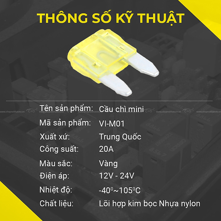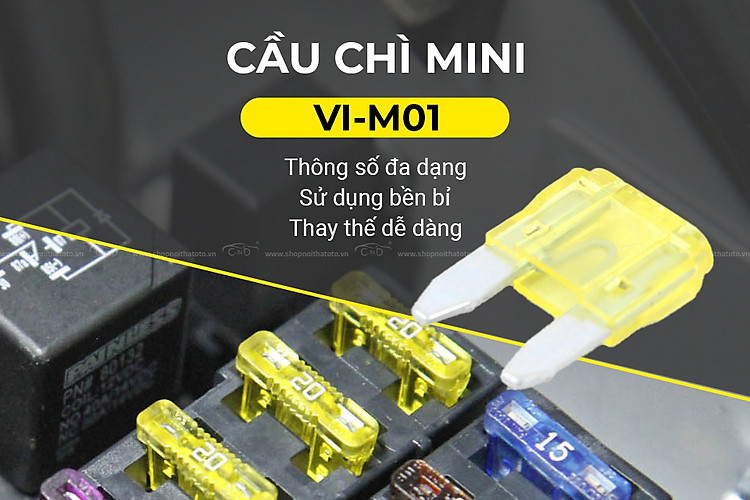 Cầu chì mini VI-M01 20A được làm bằng hợp kim kẽm và nhựa theo tiêu chuẩn và điện áp định mức, sử dụng phù hợp cho nhiều vị trí như ô tô, xe máy, nhà ở, các công trình hay ứng dụng sản xuất.