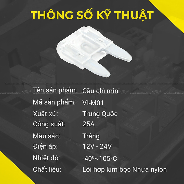 Cầu chì mini VI-M01 25A được làm bằng hợp kim kẽm và nhựa theo tiêu chuẩn và điện áp định mức, sử dụng phù hợp cho nhiều vị trí như ô tô, xe máy, nhà ở, các công trình hay ứng dụng sản xuất.