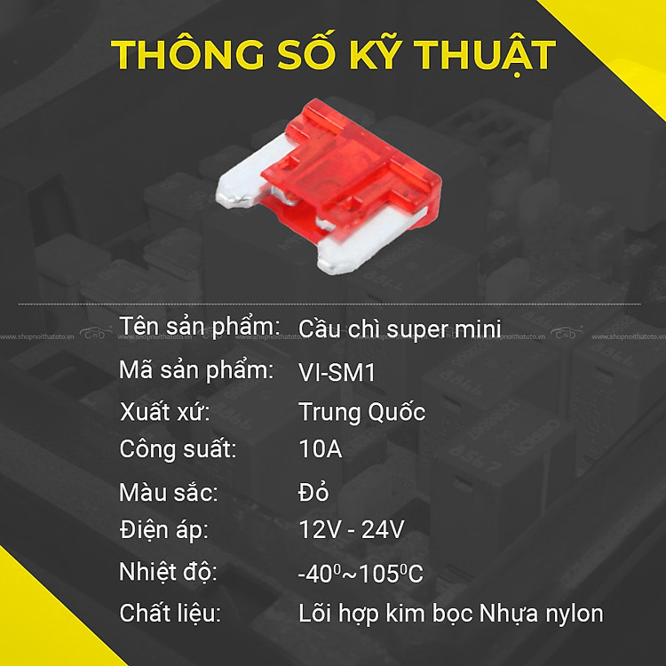 Cầu chì super mini VI-SM1 10A được làm bằng hợp kim kẽm và nhựa theo tiêu chuẩn và điện áp định mức, sử dụng phù hợp cho nhiều vị trí như ô tô, xe máy, nhà ở, các công trình hay ứng dụng sản xuất.