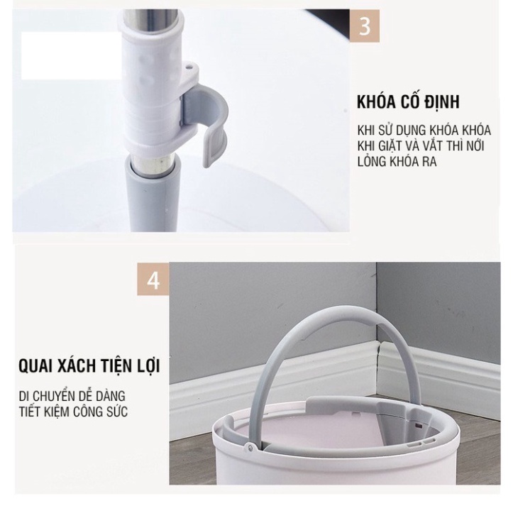 - Cây lau nhà có thiết kế mới thông minh tiện lợi thùng vắt xoay tròn gồm 1 khe để giặt cây lau và 1 khe để vắt cây lau rất sạch sẽ và tiện lợi. Có thể vắt giẻ lau khô đến 95%, thùng vắt còn thiết kế thêm rang lược để chải sạch bụi bẩn và lông tóc, có lỗ thoát nước thông minh và quai xách tiện lợi giúp cầm xách di chuyển linh hoạt.