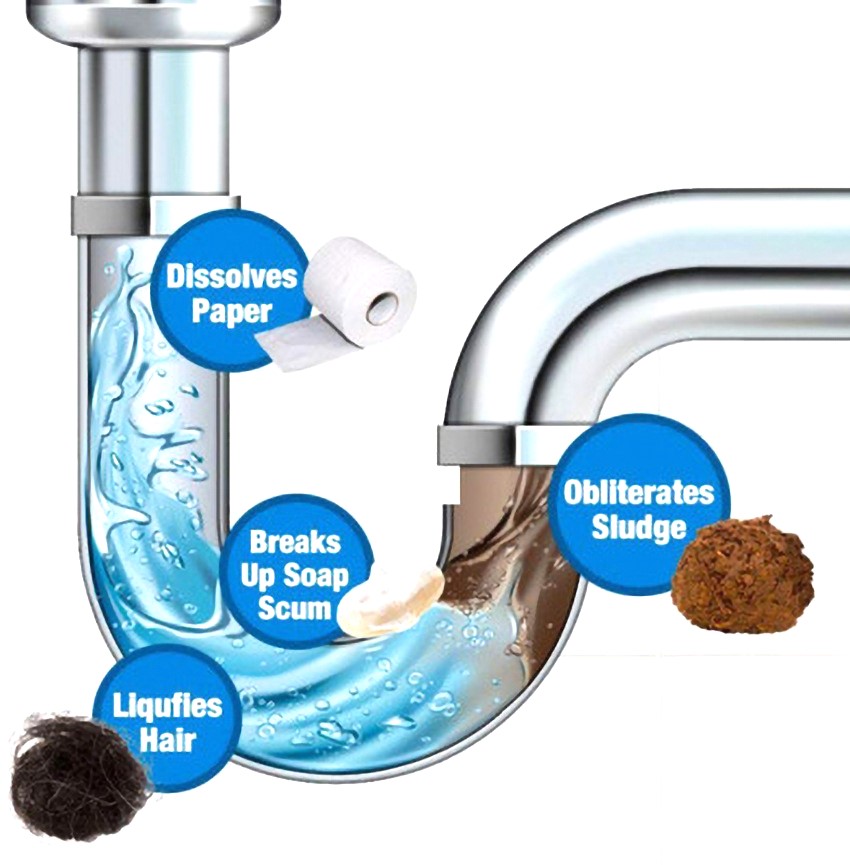 Sản phẩm chứa các hoạt chất đặc biệt phân hủy và làm mềm các chất hữu cơ gây tắc nghẽn đường ống như rêu, rác, thức ăn thừa, mỡ, cọng rau, tóc…