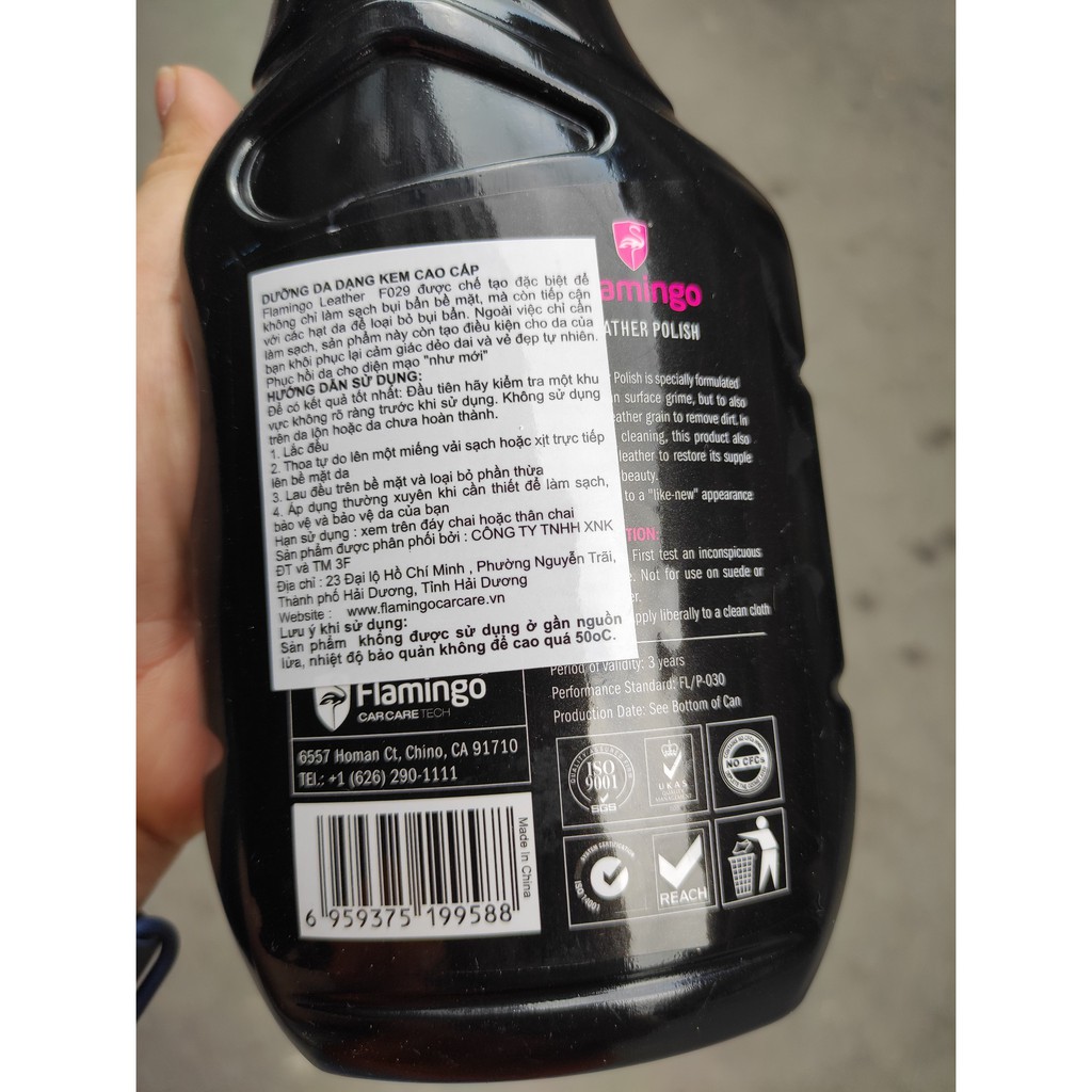 Dung dịch xịt dưỡng ghế da, nội thất Flamingo dạng kem cao cấp chính hãng -500ml. Theo thời gian, bụi bẩn và bụi bẩn tích tụ trên chỗ ngồi, cánh tay và các bề mặt khác trong xe hơi. Nhưng bây giờ nó dễ dàng làm sạch với chai xịt chăm sóc da, nội thất ô tô – Sản phẩm làm sạch sâu để loại bỏ các bề mặt da, nhựa vinyl, cao su và nhựa bẩn và bụi bẩn. Ngoài việc làm sạch bề mặt, sản phẩm phục hồi này còn có mang lại độ bóng cho da và vinyl.
