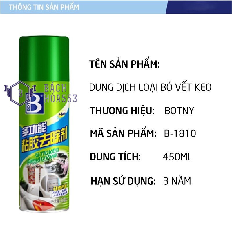 1. Công cụng của dung dịch tẩy băng dính Botny - Bình xịt loại bỏ decal, vết keo dính lâu ngày kính xe hơi, ô tô, xe tải, xe khách, thủy tinh, gỗ - Là một loại chất tẩy dính được làm với công thức đặc biệt. Nó có khả năng loại bỏ mạnh đến nỗi nó có thể xé các chất dính như giấy tự dính dính trên bề mặt cửa sổ xe, thân xe, màng sơn và đá cẩm thạch và cũng dễ dàng loại bỏ lớp keo dính còn sót lại của giấy tự dính mà không gây hư hại lên bề mặt. - Sản phẩm có mùi hương dễ chịu. - Tẩy băng dính thông thường, băng dính 2 mặt, băng keo 3M, keo silicone, nhựa đường