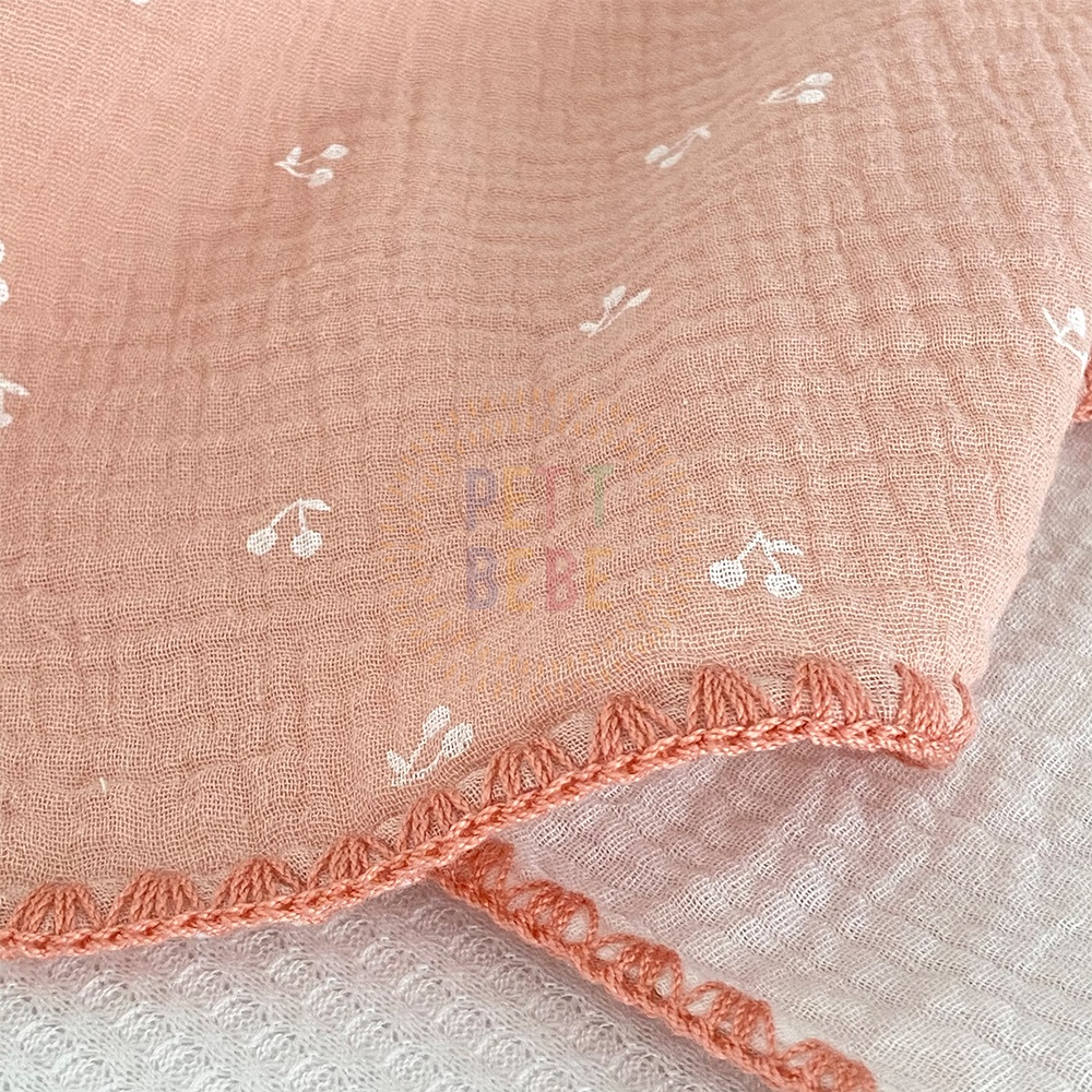 CHĂN ĐA NĂNG VIỀN THỦ CÔNG CHO BÉ PETIT BEBE MUSLIN THẤM HÚT THOÁNG KHÍ HỌA TIẾT CHERRY