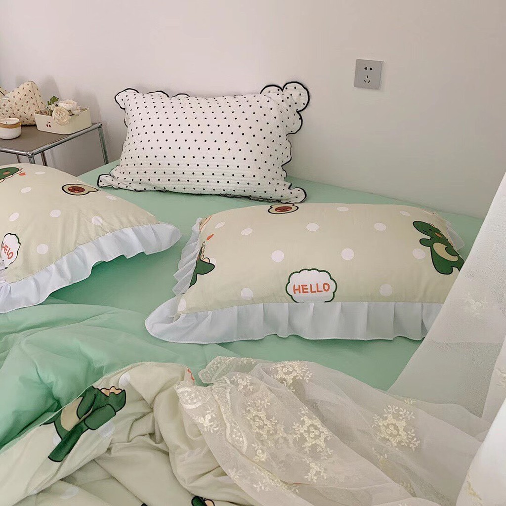 Nhà cửa & Đời sống > Chăn ga gối nệm > Chăn, mền || Bộ Chăn Ga Gối Đũi Chăn Chần Viền Bèo Khủng Long Bơ Xanh