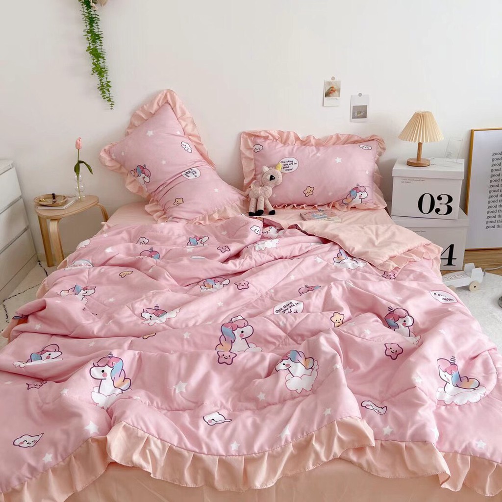 Nhà cửa & Đời sống > Chăn ga gối nệm > Chăn, mền || Bộ Chăn Ga Gối Đũi Chăn Chần Viền Bèo Ngựa Hồng