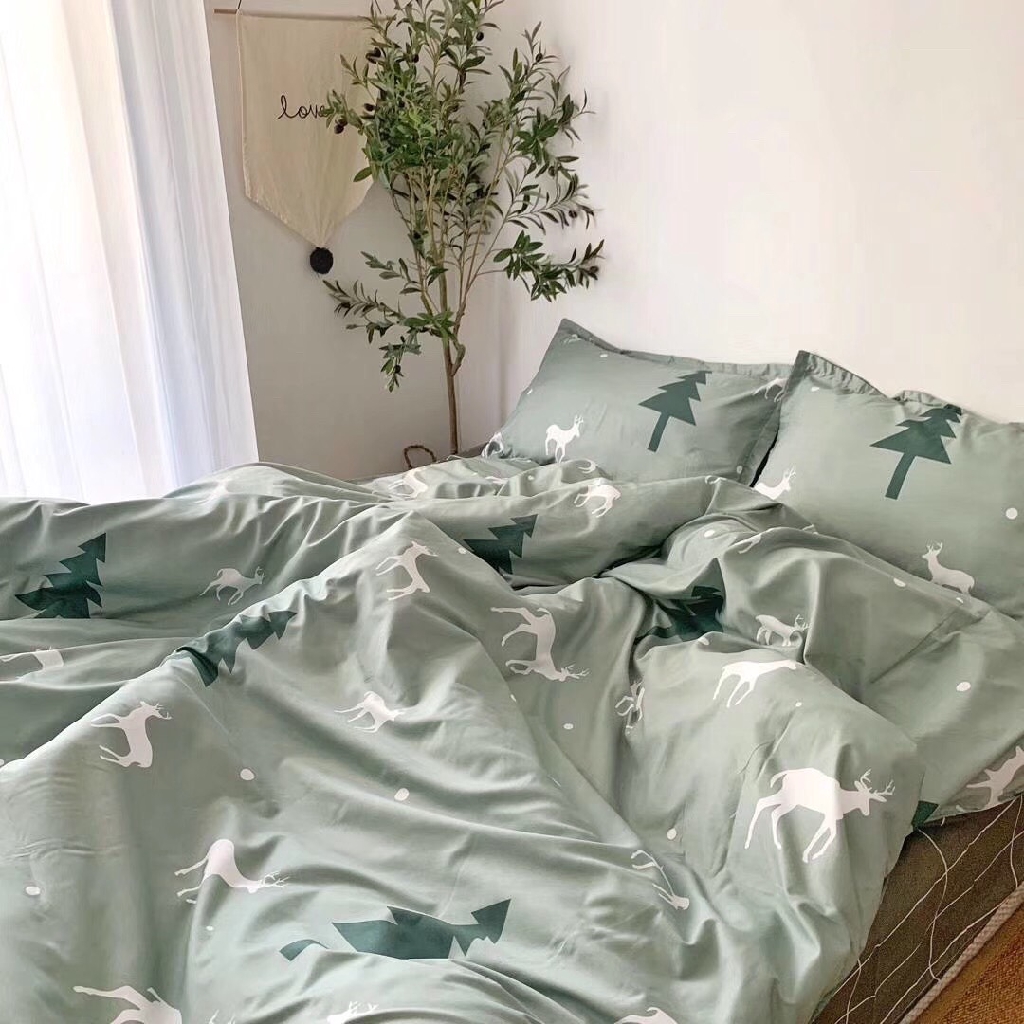 Bộ Chăn Ga Gối Poly Nhập Mẫu Hươu Nền Xanh ( Ảnh Thật)