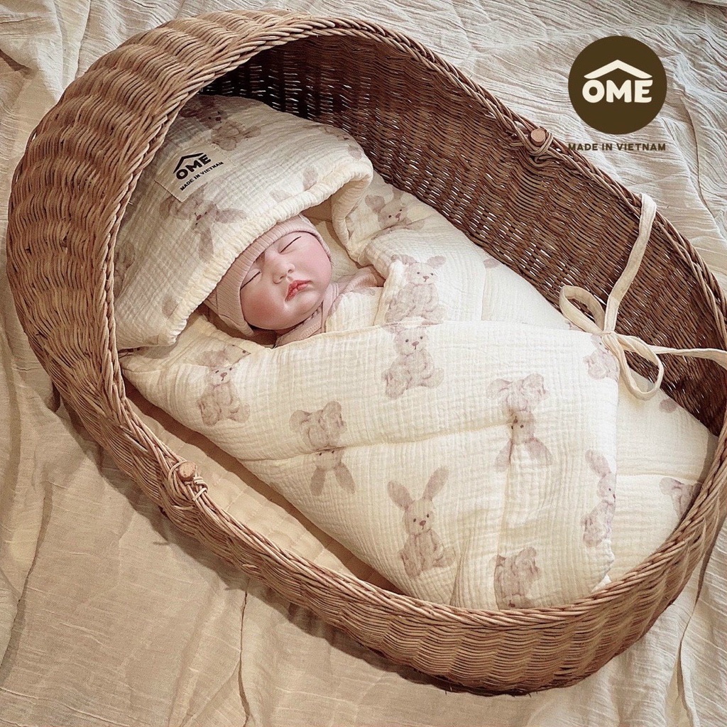 - Ủ bông OME với chất liệu vải xô, siêu nhẹ, siêu mềm giúp bé sơ sinh được thoải mái nhất kể cả khi không mặc quần áo