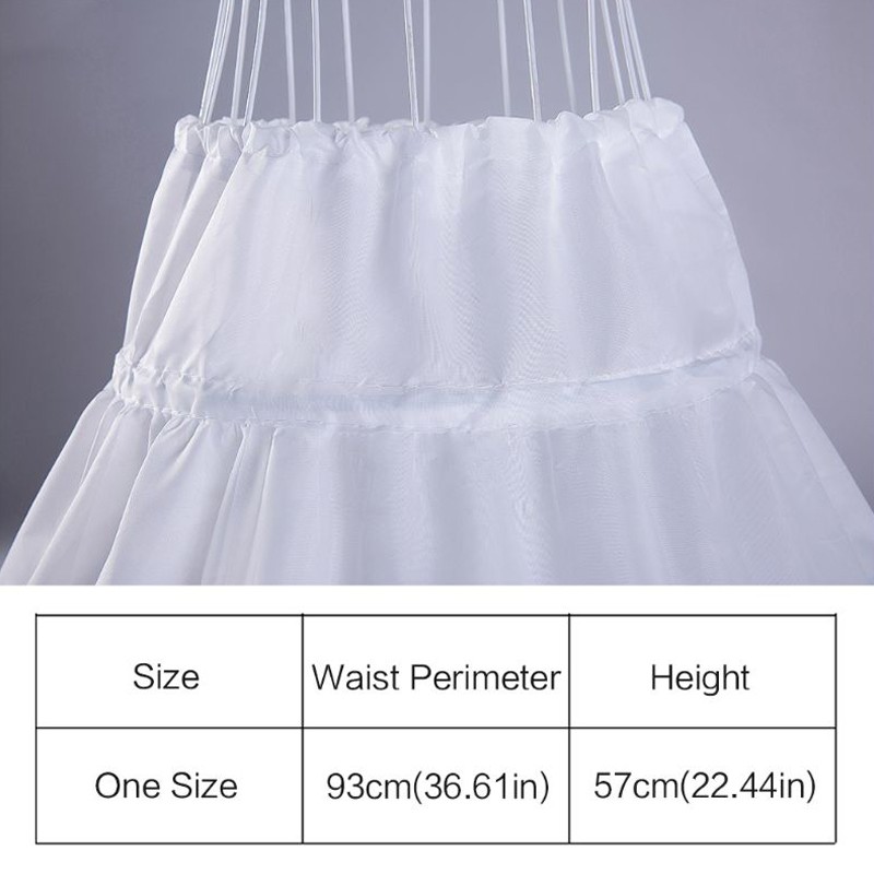 3 hoops, one layer, lace trim, white color, elastic drawstring waistband. 1 layer of soft material to hold the dress's shape, prevent scratching gentle sensitive skin. It has a drawstring that helps adjust how big or small to put around the waist. Super easy to use and put on. The quality metal hoops provide good support and shape, and made the dress a lot fuller. Made of high quality polyester taffeta, comfortable and friendly to kids' skin. This girl's petticoat is perfect for dancing, flower girl dress, communion dress, Halloween costume dress and other formal dresses. Material: Polyester Color: White Size: One Size Height: 55cm(21.65inch) Package includes:1* PetticoatOnly the above package content, other products are not included. Note: Light shooting and different displays may cause the color of the item in the picture a little different from the real thing. The measurement allowed error is +/- 1-3cm.