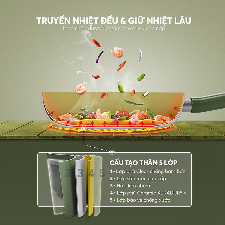 Cấu tạo đa lớp dày dặn giúp truyền nhiệt đều, giữ nhiệt lâu cho món ăn chín đều, hạn chế cháy xém