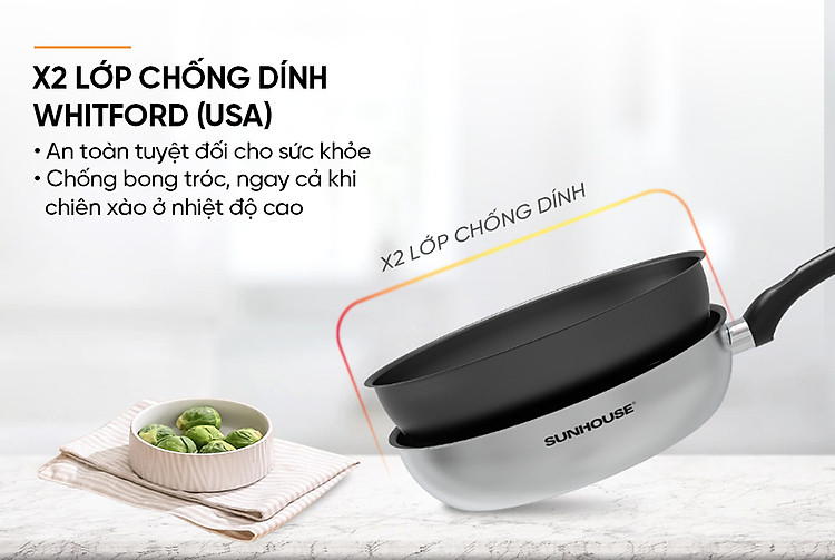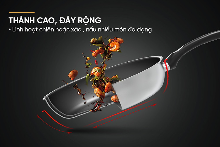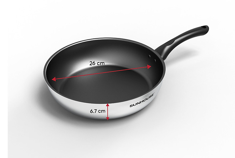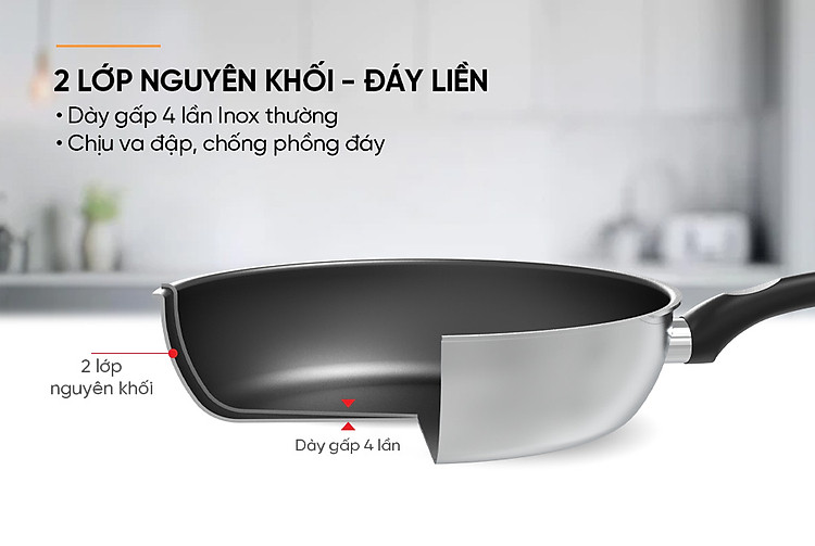 Lòng chảo phủ chống dính Whitford (USA) vân đá tinh tế, chống bám dính tối ưu, chống bám bụi và hạn chế trầy xước. Dòng chảo Inox đa lớp bao gồm các size 26 và 28 cm để bạn thoải mái lựa chọn theo nhu cầu nấu ăn trong gia đình hoặc nhà hàng.