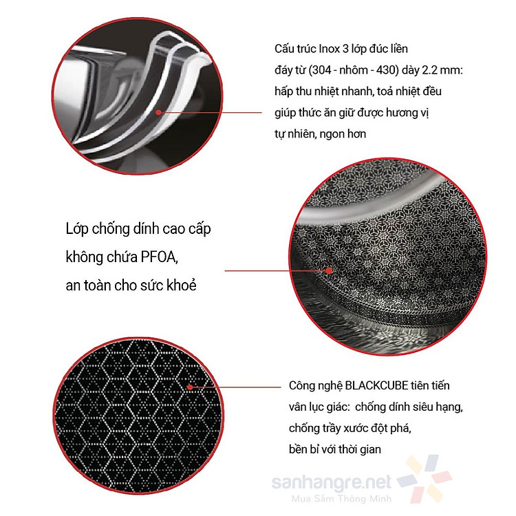- Cấu trúc Inox 3 lớp đúc liền đáy từ (304-nhôm-430 ) dày 2.2 mm : hấp thu nhiệt nhanh -toả nhiệt điều giúp thức ăn giử đựoc hương vị tự nhiên ,ngon hơn.