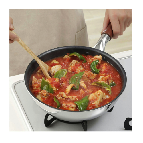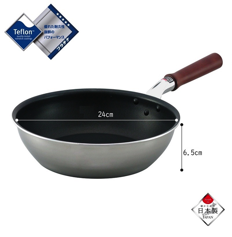 | Chất liệu | Cấu tạo 2 lớp kép (độ dày đáy 2,6 mm)Bên trong hợp kim nhôm, Bên ngoài thép không gỉ (Chrome 18%) Mặt trong tráng phủ Teflon bạch kim/ Fluororesin, Tay cầm bằng gỗ bạch dương tự nhiên |