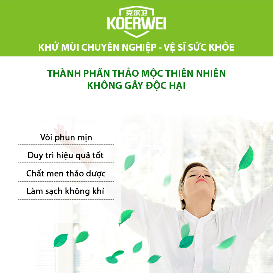 Chất khử mùi hôi KOERWEI 120ml với chiết xuất từ chất men thực vật của cây cỏ, không độc hại, thông qua giải pháp phun sương phân giải, thấm sâu, khử mùi mạnh, sản phẩm nhanh chống tiêu hủy các mùi lạ thoát ra từ máy lạnh, mùi thuốc lá, mùi tanh hoặc các mùi gây ra bởi chất hoá học, đặc biệt khử mùi hiệu quả đối với các mùi hôi cực khó chịu.