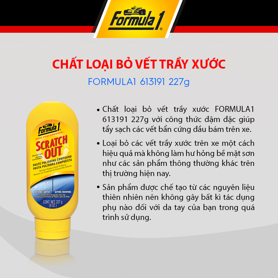 Chất loại bỏ vết trầy xước FORMULA1 613191 227g giúp loại bỏ các vết trầy xước trên mặt sơn một cách hiệu quả