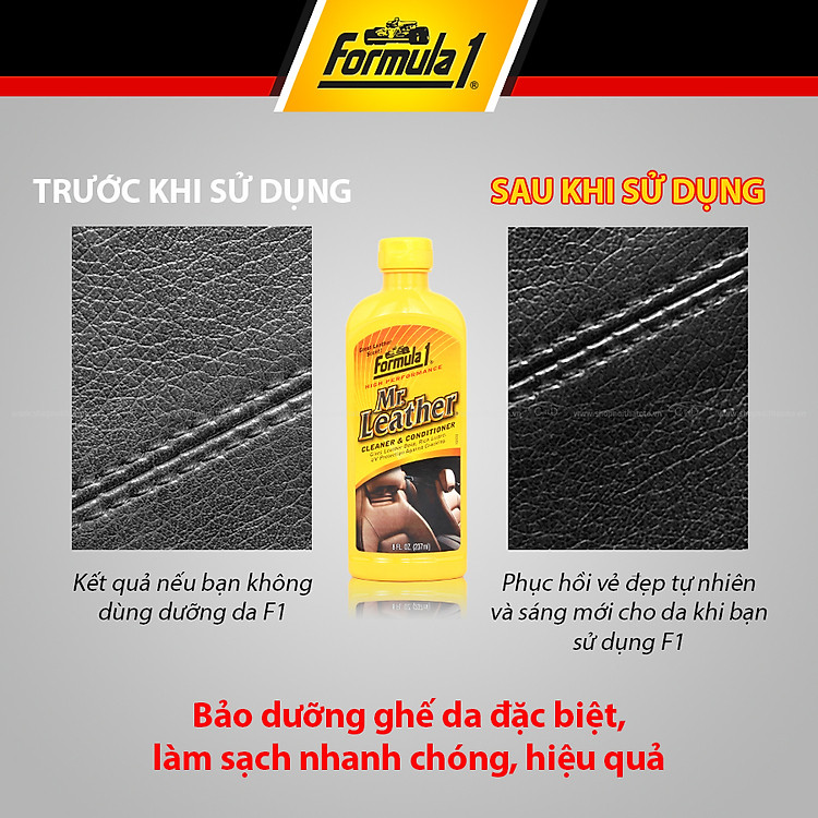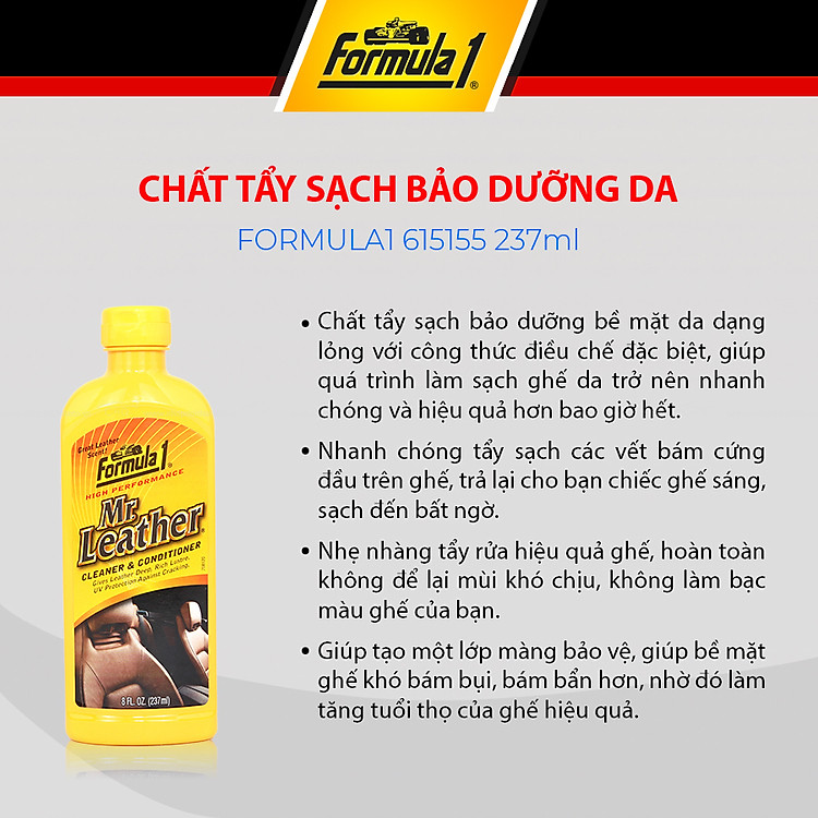 Chất tẩy sạch bảo dưỡng bề mặt da đậm đặc FORMULA 1 615155 237ml là loại chất làm sạch, bảo dưỡng ghế da đặc biệt, không những giúp làm sạch nhanh chóng, mà còn tạo lớp màng bảo vệ cho ghế mỗi lần vệ sinh.