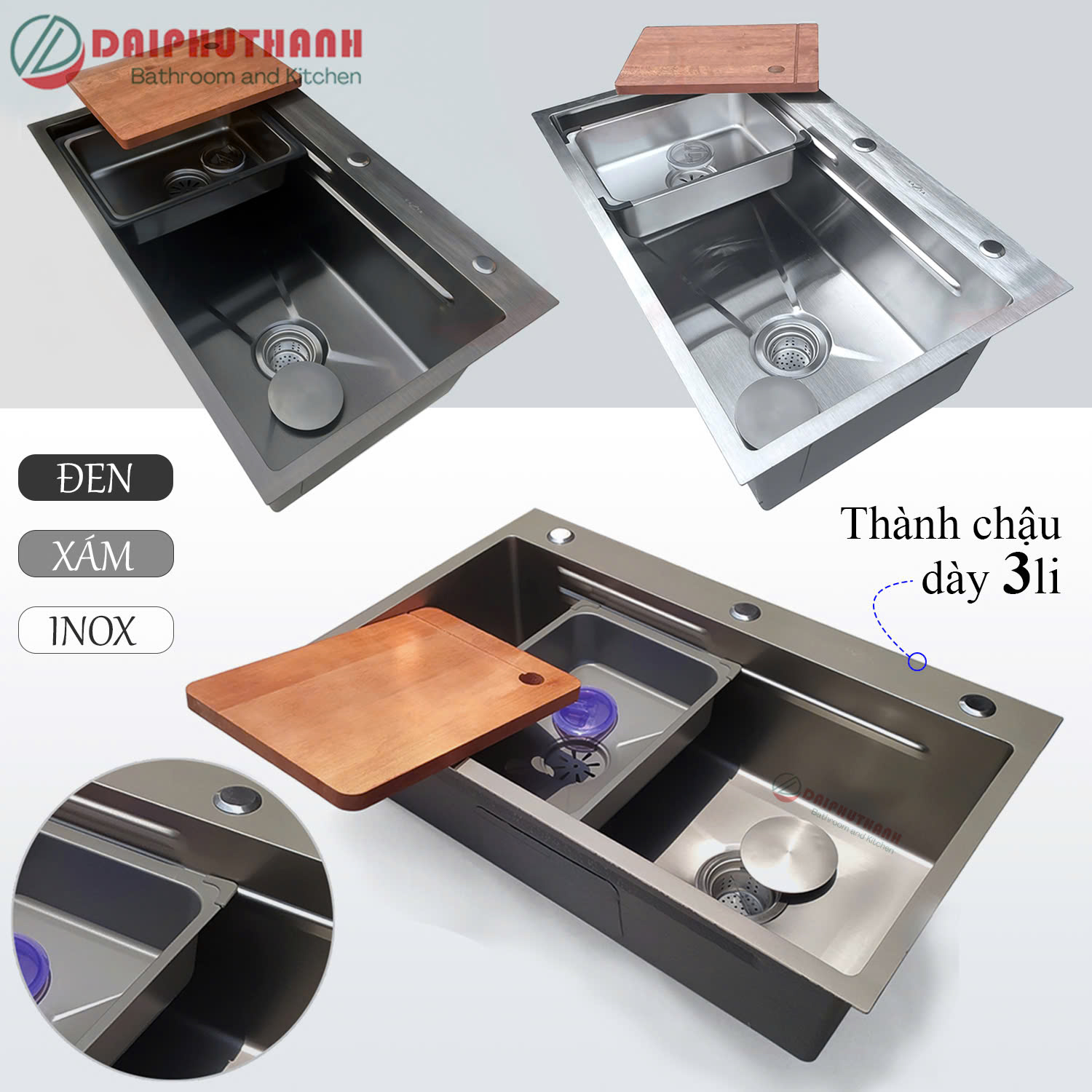 *Chất liệu inox 201 thông dụng cho gia đình, dòng chậu inox 304 cao cấp hơn, bền bỉ hơn.