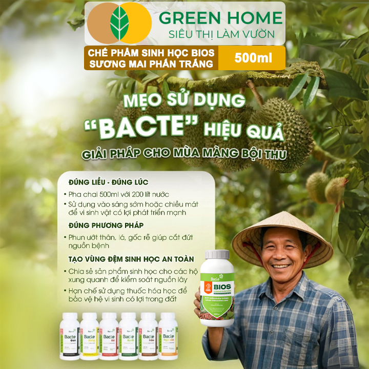 Giới thiệu Chế Phẩm Sinh Học Bacte Bios Sương Mai Phấn Trắng, Green Home, Chai 500ml, Từ Thảo Mộc, Hiệu Lực Nhanh Mạnh