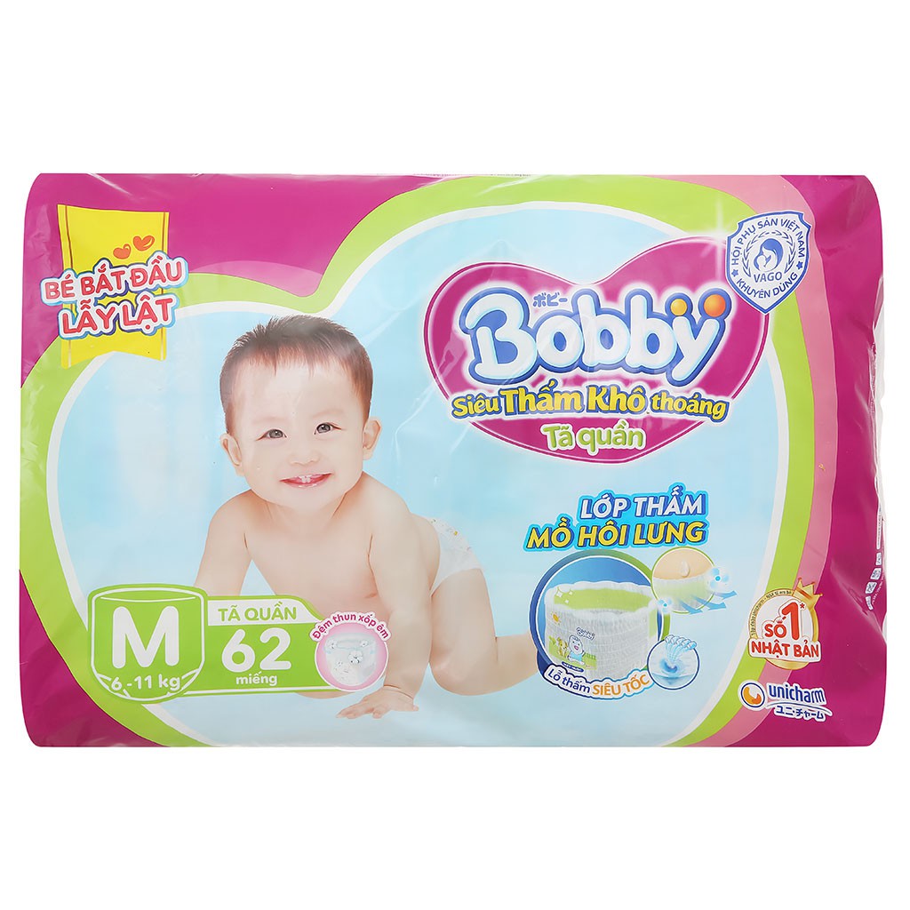 Giới thiệu [CHÍNH HÃNG] Bỉm - Tã Quần Bobby Siêu Thấm Khô Thoáng Size M62 (Lớp thấm mồ hôi lưng, cho bé 6-11kg)