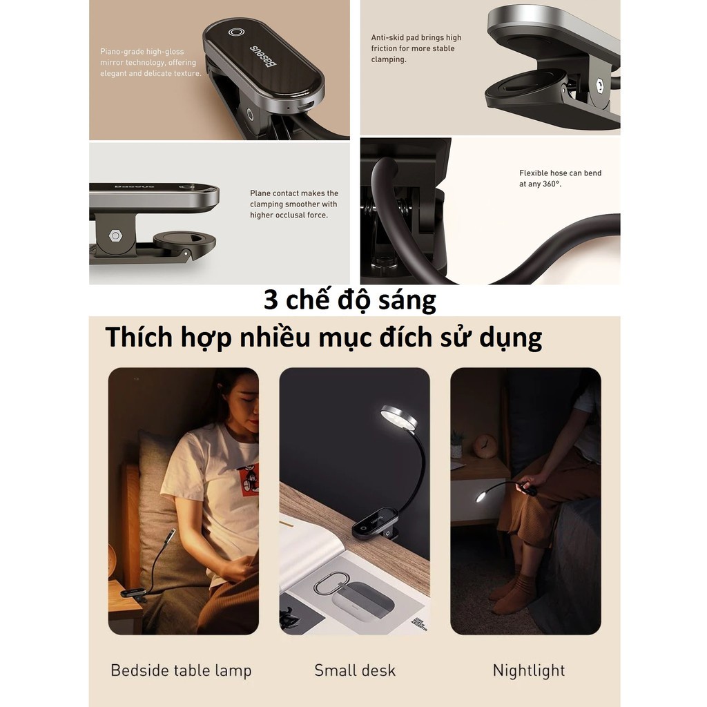 ✨GIỚI THIỆU SẢN PHẨM: - Đèn đọc sách mini Baseus dạng kẹp chống cận pin sạc tiện dụng (Dịu mắt, cảm ứng, 3 mức sáng, 350mAh, 24h)