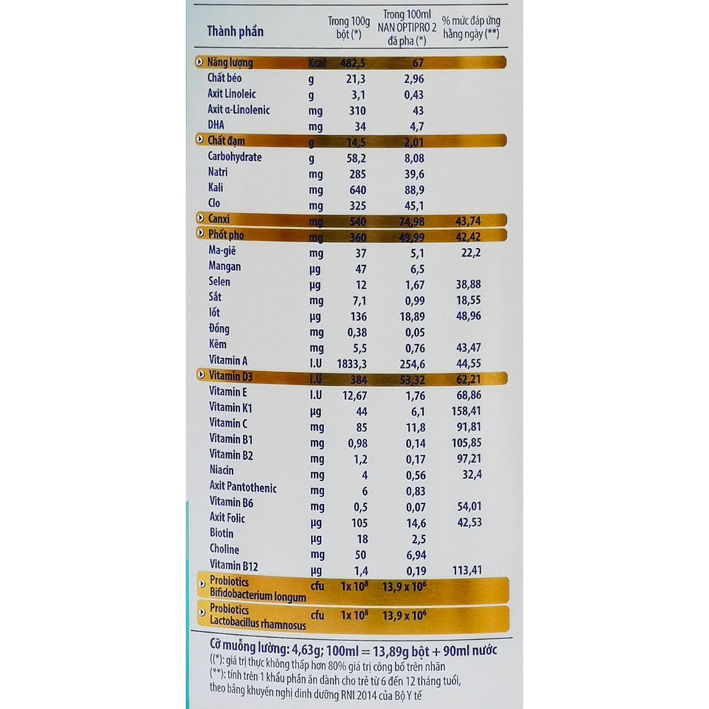 Sữa Bột Nestlé NAN Optipro 2 là sản phẩm công thức dùng bổ sung thêm vào khẩu phần ăn hàng ngày của bé trong giai đoạn từ 6 đến 12 tháng, giúp cân bằng dinh dưỡng, cung cấp các dưỡng chất cần thiết cho sự phát triển thể chất và trí não, tăng cường trí thông minh cho trẻ