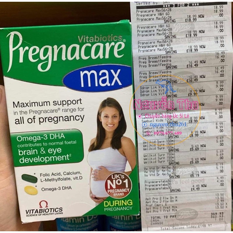 🍀🍀🍀PREGNACARE MAX là viên uống vitamin tổng hợp dành cho phụ nữ ngay từ khi dự định mang thai, 9 tháng thai kỳ và trong thời gian cho con bú. Với 2 viên nang riêng biệt màu xanh và màu vàng, Pregnacare Max bổ sung theo đúng chuẩn các chất dinh dưỡng giúp dễ dàng hấp thụ cho mẹ bầu và thai nhi. 🍀🍀🍀Đối tượng sửa dụng Viên uống vitamin tổng hợp Pregnacare max được uống ngay từ khi mẹ có kế hoạch mang thai, trong suốt thời gian mang thai & trong thời gian cho con bú. 🍀🍀🍀CÔNG DỤNG: 👉🏼 Vitabiotics Pregnacare Max cung cấp 400μg axit folic, hình thức đặc biệt dễ dàng sinh học L-Methylfolate, cùng với các vitamin và khoáng chất thiết yếu khác, bao gồm cả 10μg Vitamin D, canxi 500mg, cộng với 300mg DHA. 👉🏼 Hộp có 84 viên trong đó có 56 viên Pregnacare Max (màu xanh)+ 28 viên Omega-3 (màu vàng), rất dễ uống, dễ hấp thu 👉🏼 Giúp làm giảm các triệu chứng ốm nghén trong 3 tháng đầu thai kỳ như: hoa mắt, buồn nôn, chóng mặt, mệt mỏi... 👉🏼 Chống táo bón cho mẹ trong suốt thai kỳ 👉🏼 Giúp nâng cao chất lượng nguồn sữa mẹ, bồi bổ và khôi phục sức khỏe cho mẹ sau sinh. 👉🏼 Không sử dụng chất bảo quản, chất tạo màu, tạo mùi hay bất cứ chất hóa học độc hại nào khác nên mẹ hoàn toàn có thể yên tâm sử dụng 🍀🍀🍀CÁCH DÙNG: Mỗi ngày uống 2 viên Pregnacare® Max (màu xanh)và 1 viên Omega-3 (màu vàng) sau bữa ăn trước khi mang thai, trong khi mang thai & suốt thời gian cho con bú. 🍀🍀🍀Các mẹ cần lưu ý: 👉🏼 Không được nhai, uống sau khi ăn. 👉🏼 Không được uống vượt quá liều lượng quy định . 🍀🍀🍀Bảo quản: ở nhiệt độ dưới 25 độ C, ở nơi khô ráo và thoáng mát.