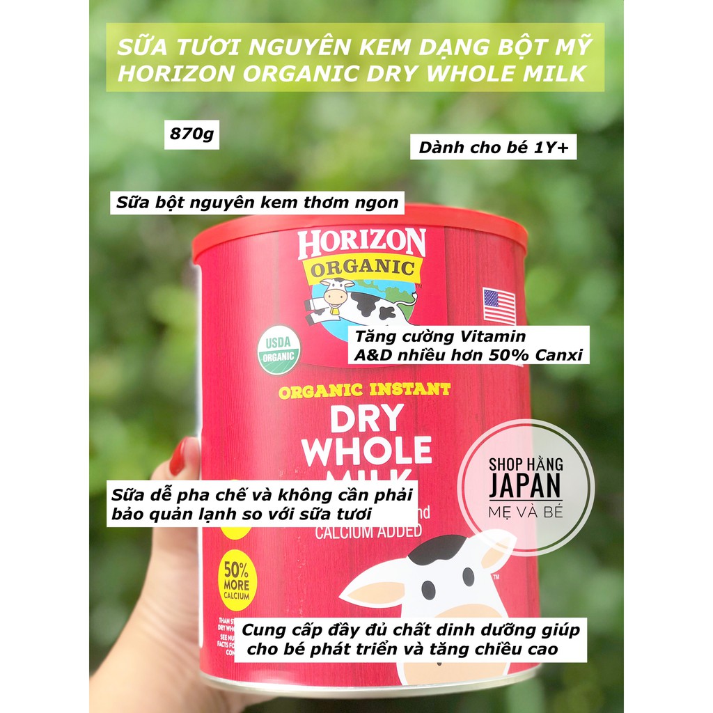 * THÔNG TIN: Sữa Horizon Organic Dry Whole Milk - Sữa tươi dạng bột hữu cơ Organic Horizon 870gr - SỮA TƯƠI HỮU CƠ ORGANIC - HORIZON - SỮA MÁT, GIẦU DINH DƯỠNG ĐẶC BIỆT TỐT CHO BÉ TỪ 1 TUỔI... - SỮA TƯƠI HORIZON ORGANIC Đặc biệt GIÚP BÉ TĂNG CHIỀU CAO RÕ RỆT, giai đoạn bé cần tăng cân thì các mẹ có thể mix kèm với sữa Pediasure cho bé nhé... - Dòng sữa tươi Organic Horizon rất được ưa chuộng ở Mỹ vị thanh của sữa, đúng vị sữa tươi, ko quá ngọt, ko quá béo bé nào cũng thích. - Nay hãng đã cho ra mắt Sữa tươi dạng Bột xịn sò mới toanh bổ sung thêm 50% Canxi nhiều hơn các loại sữa tươi thông thường khác. - Nói đến Horizon các mẹ an tâm một điều là chứng nhận Organic, bò được ăn thức ăn sạch. Non-GMO có nghĩa là sữa ko chứa chất biến đổi gen, ko gây dậy thì sớm cho bé - Sữa tươi Horizon organic là thương hiệu sữa hữu cơ đầu tiên được chứng nhận tại Mỹ. Với hơn 25 năm đi đầu và phát triển, liên kết với gần 700 trang trại đã được chứng nhận hữu cơ trên khắp đất nước Mỹ, sữa tươi organic Horizon đã khẳng định được vị thế vô cùng quan trọng trong ngành sữa hữu cơ nước Mỹ. Với các tiêu chuẩn về hữu cơ