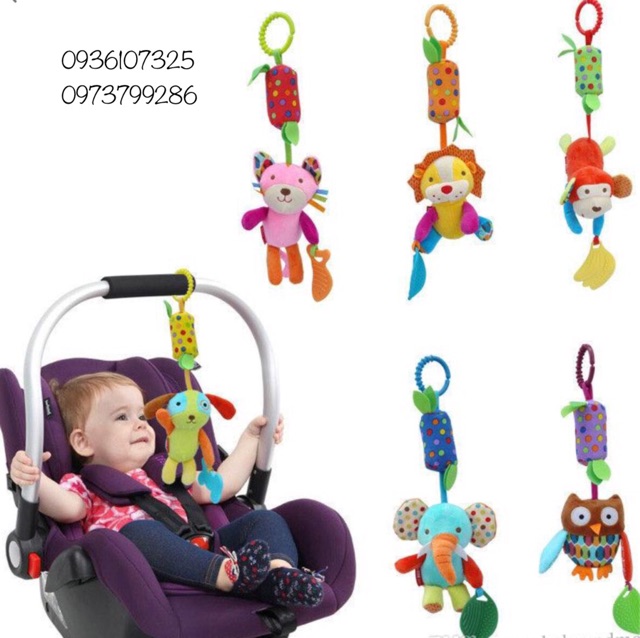 Đồ chơi treo nôi cũi, xe đẩy, ghế nằm, kệ chữ A hoặc bất cứ nơi nào có thể móc vào. Đồ chơi được thiết kế bằng vải mịn, chất đẹp, các con thú xinh xắn bắt mắt, kích thích thị giác cho bé. Ngoài ra còn có tiếng kêu leng keng như chuông gió kích thích thính giac của bé. Mẹ cũng có thể cho bé cầm tay chơi để bé gặm nướu. (Miếng gặm nướu chính là hình khúc xương của con chó, lá của chú cú... gặm nướu hỗ trợ mọc rặng). Đồ chơi dài 38cm.