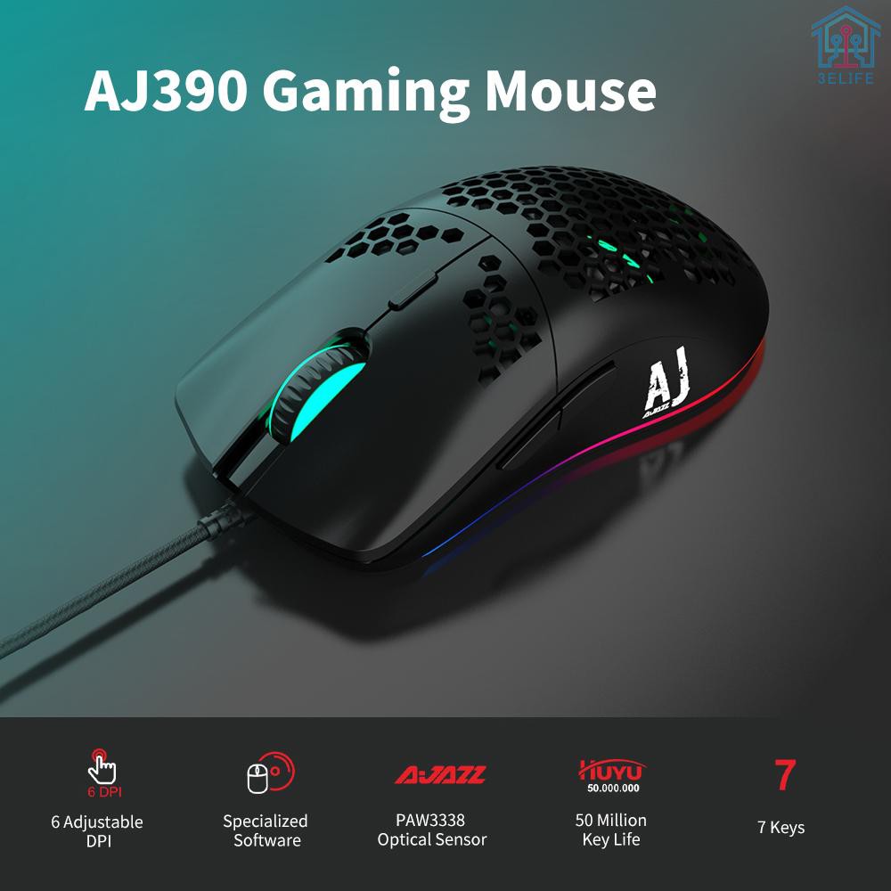Features: High-precision Optical Sensor This mouse adopt high-precision PixArt PAW3338 optical sensor, with high sensitivity of 16000DPI, 12000fps scan rate, 1000Hz polling rate, able to withstand 40G acceleration and 400IPS movement speed, which can meet your needs of fast web browsing and gaming. Symmetrical Ergonomic Design Adopt symmetrical ergonomic design, suitable for left or right hands and different holding positions, more flexible and comfortable, and will not fatigue after long-term use. Hollowed-out Honeycomb Design This design meets the ventilation and cooling effect required by the game player for a long time playing, avoids the feeling of hot hands and palms during the game. It also has a cool visual appearance. Exquisite Texture The top cover of the mouse adopt delicate surface treatment technics, brings comfortable feel and delicate texture. Lightweight Design The net weight of this is about 69g, which can reduce the burden of hand, easy to control, provide smooth operation. Plug and Play Powered by USB, plug and play, no driver required, convenient to use. Specification: Item name: Wired mouse Brand: Ajazz Model: AJ390 Color: Black/White(optional) Image sensor: PAW3338 Number of keys: 7 Rate of return: 125Hz-1000Hz Acceleration: 40G Movement speed: 400IPS Support OS: Windows 2000/XP/Vista/Win7/Win8/win10/Mac Item size: 12.9 * 6.7 * 3.8cm /5.08 * 2.64 * 1.5in(L * W * H) Item weight: Approx.69g /2.43oz Packing list: 1 * Wired mouse 1 * User manual