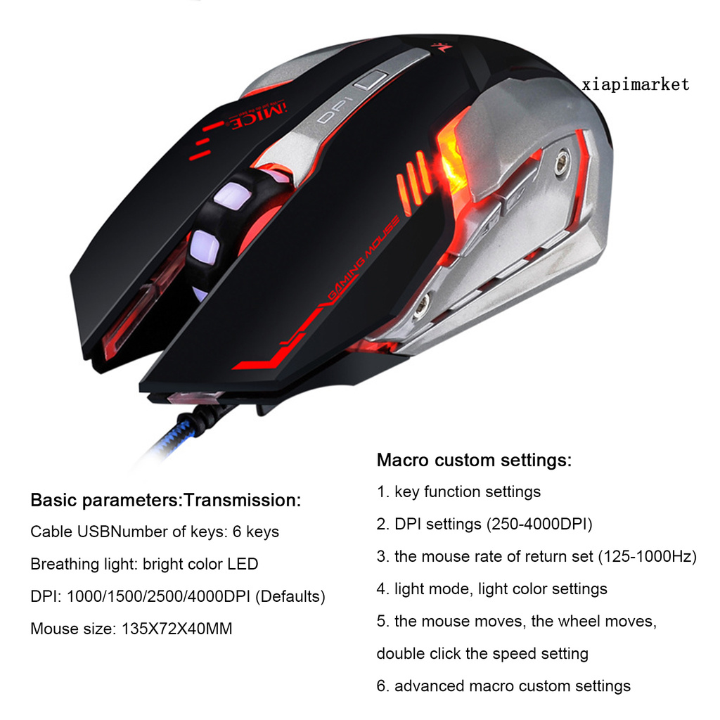 Item Name: Wired Mouse Material:ABS Resolution: 1000-1500-2500-4000DPI Number of Keys: 6 Keys Transmission Interface: Wired USB Operation Mode: Photoelectric Type Wireless Transmission Frequency: 2.4GHz Breathing Lamp: LED Colorful Automatic Breathing Lamp Size:13.5cmx7.2cmx4cm/5.31inx2.83inx1.57in