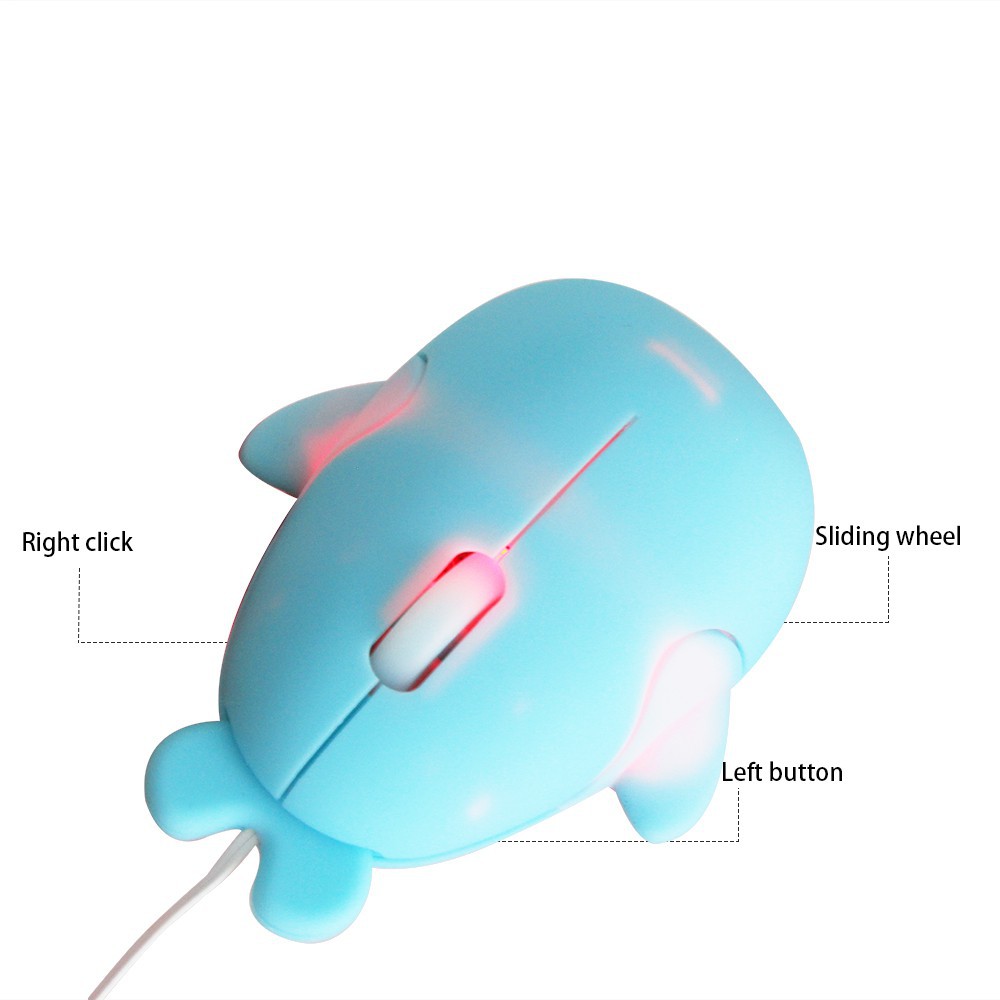 product description: - Name: Retractable line mute version of the Dolphin mouse - Color: blue, pink - Size: Length: 100mm/3.9in Width: 80mm/3.2in Height: 35mm/1.4in - Net weight: 56g - Line length: 1.4m - Type: Optical mouse - Mouse size: mouse (≤100mm) - Connection method: wired - Applicable models: laptop, desktop - Photoelectric resolution: 1200 (dpi) - Number of buttons: 3 (key) - Interface: USB - Support for ergonomics: support - Operating distance: 1.4 (m) - How it works: Photoelectric - Features: Cartoon