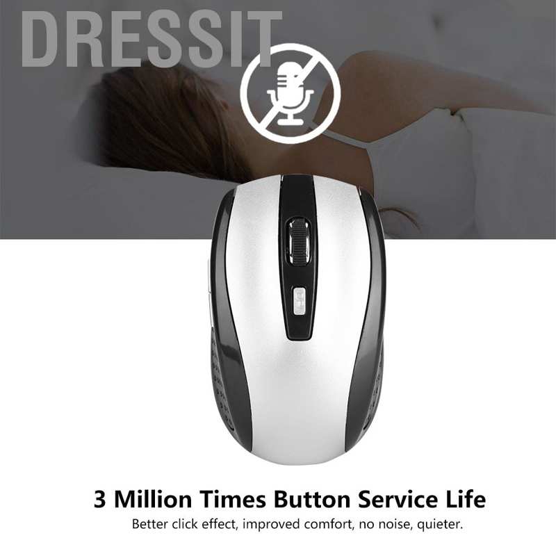Specifications: Color: Silver Photoelectric Resolution: 1200dpi (dpi) Interface: USB Key Number: 6 (key)--Left and right buttons, pulleys (can be pressed), forward and backward keys (for browsing web pages and folders), keys to change resolution (under pulleys) Battery: AAA*2 (without battery) Wireless Transmission Distance: ≥ 10m Wireless Carrier Frequency: 2402MHz-2480MHz Wireless Working Channels: 16, automatic frequency hopping Rated Working Current: 8-15mA@3V Key Stroke: 0.8mm Press Force: 60-70 ± 10g Button Lifetime: 3 million times Size: Approx. 10 * 6 * 3.5 cm / 3.9 * 2.4 * 1.4 in Weight: 53 g