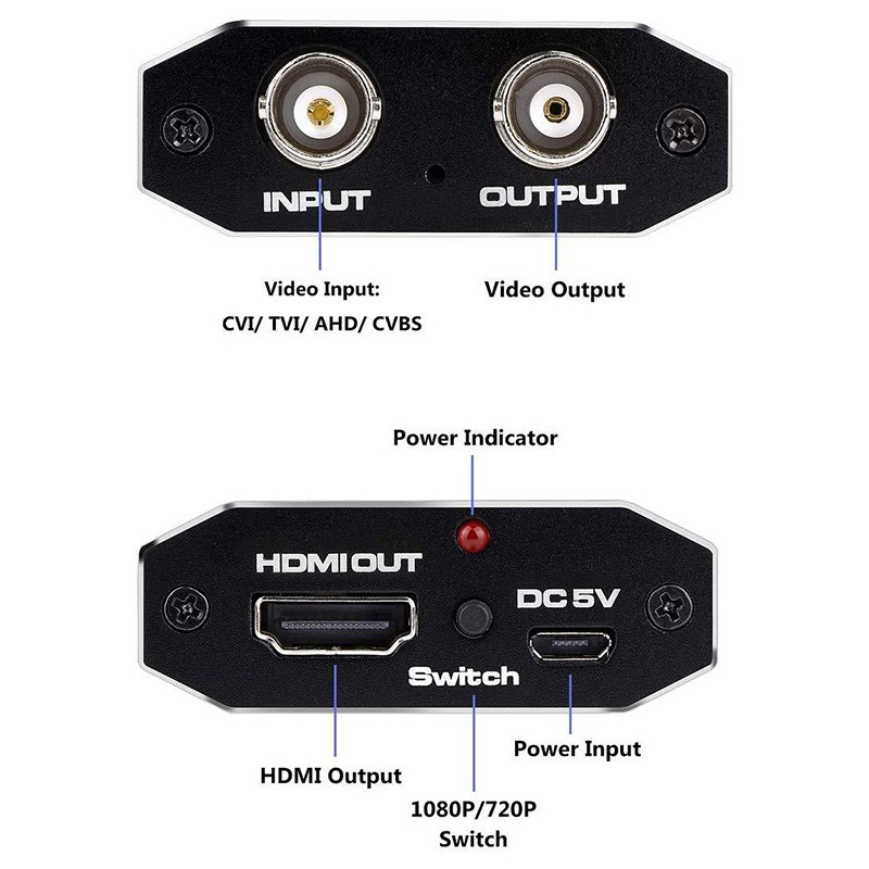 TVI CVI AHD CVBS to 1080P HDMI Output: Plug and play; It converts TVI CVI AHD CVBS security camera signals to HDMI monitor. The HDMI Video output is 1080p/720P@60Hz resolution, You can select by the switch. And It have BNC Video Loop Out port, that you can connect multiple monitors. 4K HD CVI/TVI/AHD/CVBS BNC Loop Output: High-definition video processing technology. Restoring non-loss HD images and maintaining the image brightness, contrast, and color. Auto recognition resolution: Supports 720P, 1080P, 3MP, 4MP, 5MP, 8MP for TVI/AHD input; Supports 720P, 1080P, 4MP, 8MP for CVI input.Long Transmission Distance; 500-700 meters over coax cable; Different resolution, different transmission distance. Widely Applications: TVI/CVI/AHD to HDMI Converter widely used for shopping malls, home monitoring, high-definition monitoring, elevator monitoring, traffic monitoring and so on. Specifications: Transmission Distance: 500~700 meters (Different resolution, different transmission distance) colour: black Material: aluminum alloy size: 90 * 53 * 21mm Package Contents: 1x TVI/CVI/AHD to HDMI Converter 1x User ManualOnly the above package content, other products are not included. Note: Light shooting and different displays may cause the color of the item in the picture a little different from the real thing. The measurement allowed error is +/- 1-3cm.