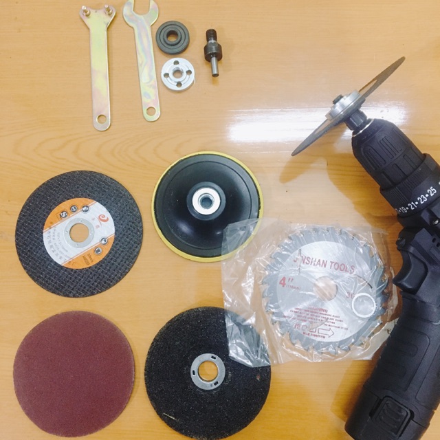 Bộ biến máy khoan tay thành Máy cắt - Máy cưa - Máy mài trục 6mm và 10mm * THÔNG TIN SẢN PHẨM - Sản phẩm bao gồm 2 loại trục 6mm và 10mm khách hàng tuỳ chọn 2 kẹp đĩa đen – trắng, 2 cờ lê tháo lắp. - Ngoài ra còn có bộ phụ kiện 5/6/7món: 1 lưỡi cưa 1 lưỡi cắt 1 lưỡi mài 1 đầu dán dính 2 miếng dấy nhám 1 lưỡi mài xếp 1 chổi sắt