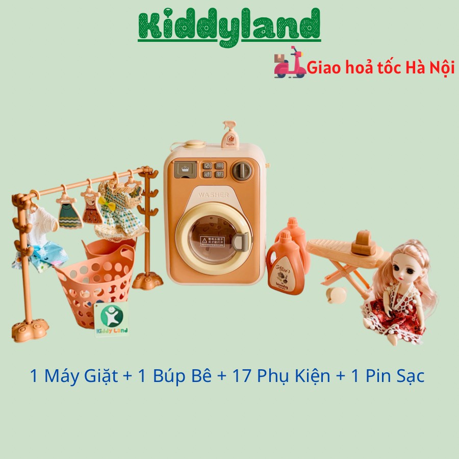 (Có búp bê) Đồ chơi máy giặt cao cấp cho bé có đèn LED và nhạc (Tặng kèm Pin) THÔNG TIN SẢN PHẨM -Chất liệu: Nhựa -Đóng gói: Hộp -Kích thước hộp sản phẩm: 25 * 23 * 13CM -Kích thước máy giặt 23x17cm -Dùng pin AA (TẶNG KÈM PIN) - Màu sắc: Cam Hồng - Xanh - Gồm 3 mẫu: Máy giặt đơn, Máy giặt 18 chi tiết: Quần áo, giàn phơi, mắc, bàn là.... Máy giặt 19 chi tiết: Búp bê, Quần áo, giàn phơi, mắc, bàn là....