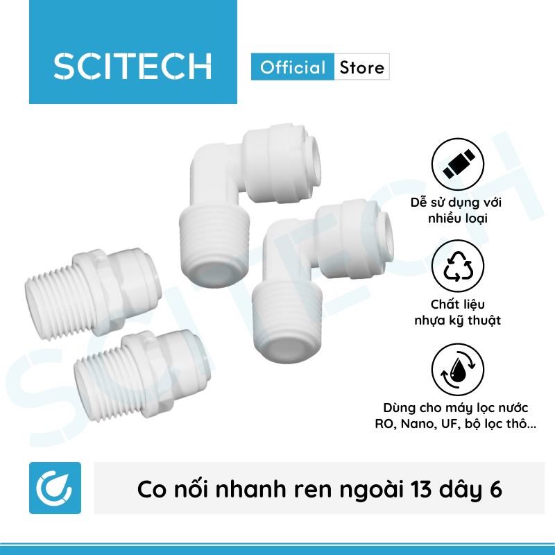 Co nối nhanh ren ngoài 13/17/21 ra dây 6 hoặc ren ngoài 13/17/21 ra dây 10 máy lọc nước dùng để kết nối các phần trong máy lọc nước RO, máy lọc nước Nano và các hệ thống lọc nước khác. Co nối được làm từ chất liệu nhựa kỹ thuật chắc chắn và dễ dàng sử dụng, thay thế.