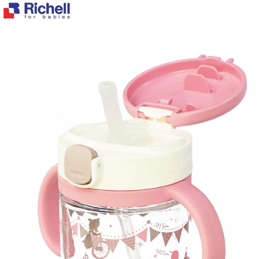 Đặc Điểm Cấu Tạo Cốc Ống Hút Richell *Thân cốc ống hút Richell được làm từ nhựa Polyester cao cấp có độ bền và độ trong cao, không chứa BPA hay bất kỳ chất độc hại nào ảnh hưởng tới bé. Vòi hút bằng silicone mềm mại, nhẹ nhàng với răng, lợi bé. *Toàn bộ hệ thống ống hút nằm trọn dưới nắp gập liền thân có lẫy đóng – mở tiện dụng vừa đảm bảo vệ sinh, vừa không lo thất lạc nắp. Lẫy bật mở rất nhẹ, không lo đập vào miệng hay mặt bé khi tiếp xúc gần. *Có khả năng chống rò 100%, đầu hút chỉ tiết nước khi bé hút. Kết hợp với nắp đậy chắc chắn, cốc phù hợp cho mọi hoạt động khám phá của bé, kể cả khi bé dốc ngược hay cầm cốc chạy nhảy, thuận tiện cho mẹ khi mang theo ra ngoài. *Tay cầm có thể tháo rời khi không sử dụng, hoặc trở thành bình nước cho mẹ khi bé lớn lên với thiết kế đẹp mắt. *Bổ sung vạch chia dung tích (ml) trên thân giúp mẹ dễ dàng theo dõi lượng nước bé uống hoặc khi muốn pha sữa trực tiếp vào cốc.