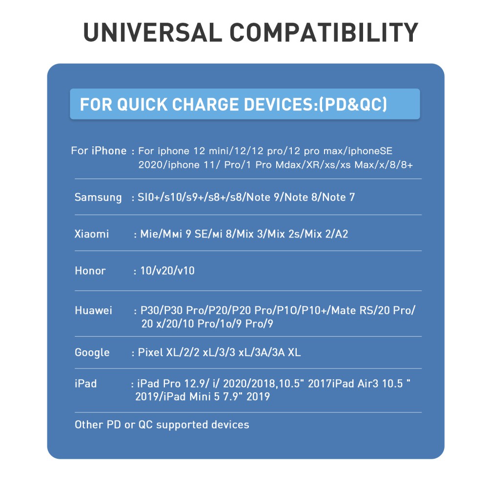 Package Included: 1×PD charger Specifications: Product parameter Product name: PD20W charger Product Specification: US Plug Product color: white, black Product material: ABS+PC Input voltage: AC100-240V 50/60HZ 0.5A Output voltage: 5V=3A(MAX) 9V=2.2A 12V=1.6A Applicable products: mobile phones, tablets, digital electronic products and other equipment Product size: 57×42×27mm Product weight: 40g Gross weight: 45g Description: -USB Type-C connection supports multi-protocol output, fast charging makes charging faster -Support Huawei, Xiaomi, Samsung fast charge protocol, all models can be fast charge. -The output automatically recognizes the mobile phone or tablet, intelligently matches the 5V3A / 9V2A/ 12V1.6A voltage and current, and selects the fast charging mode suitable for the device. -The battery protection filters many risks. -Compatible with existing mainstream Android phones and Apple devices that support fast PD charging. - It is small in size and easy to carry, light in size and easy to carry. -iPhone12/11, /X Android are compatible, mobile phones/iPad/game consoles can be charged. Notes: Note: Due to the difference in light and screen, the color of the project may be slightly different from the picture. Due to manual measurement, please allow a difference of 1-2mm. To make the device get fast charging effect, the charging device, data cable, and charger must all support fast charging to achieve the fast charging effect.