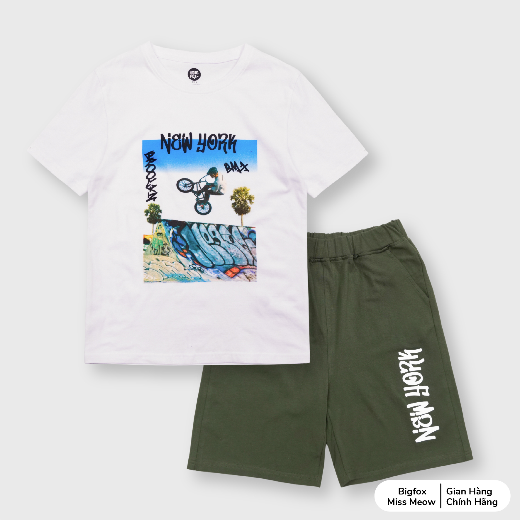 Đồ bộ cộc tay bé trai size đại Bigfox Miss Meow mùa hè vải cotton kiểu dáng Hàn Quốc in xe đạp cỡ 12-15 tuổi 40kg 50kg