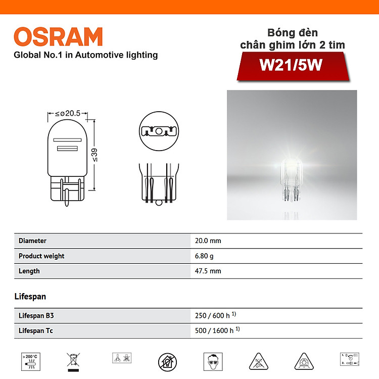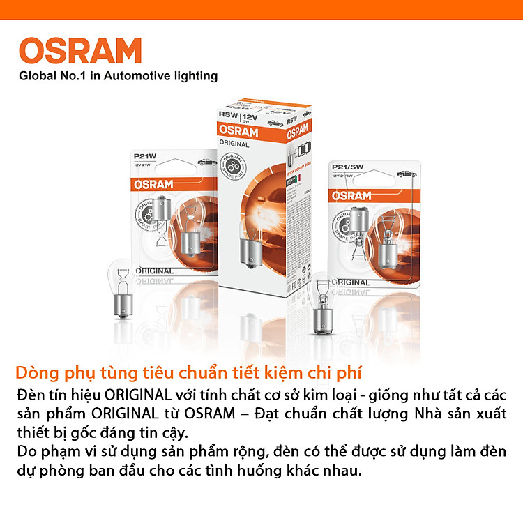 - Combo 10 Bóng Đèn Chân Ghim Lớn 2 Tim OSRAM Original W21/5W 12V 21/5W được chế tạo bằng thủy tinh cao cấp đạt tuổi thọ sử dụng cao giúp hỗ trợ chiếu sáng hiệu quả trên những chặng đường dài