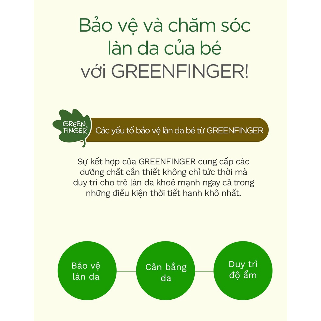 * GREENFINGER CHOKCHOK quan tâm đến sự phát triển của làn da bé, và đã chọn lọc những chất làm mềm tự nhiên giàu chất dưỡng ẩm, để giúp làn da của con bạn giữ được độ ẩm lâu hơn, trở thành một làn da khỏe mạnh và ngậm nước hơn!