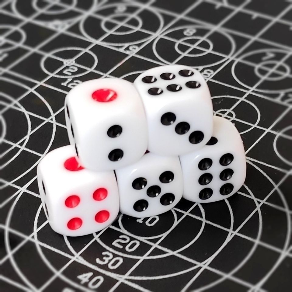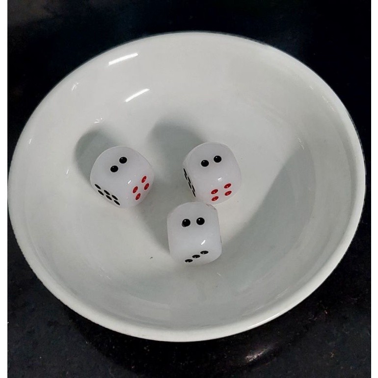 Thiết kế: Xúc xắc 6 mặt tiêu chuẩn với các điểm (dots) màu đen và đỏ biểu thị giá trị từ 1 đến 6.