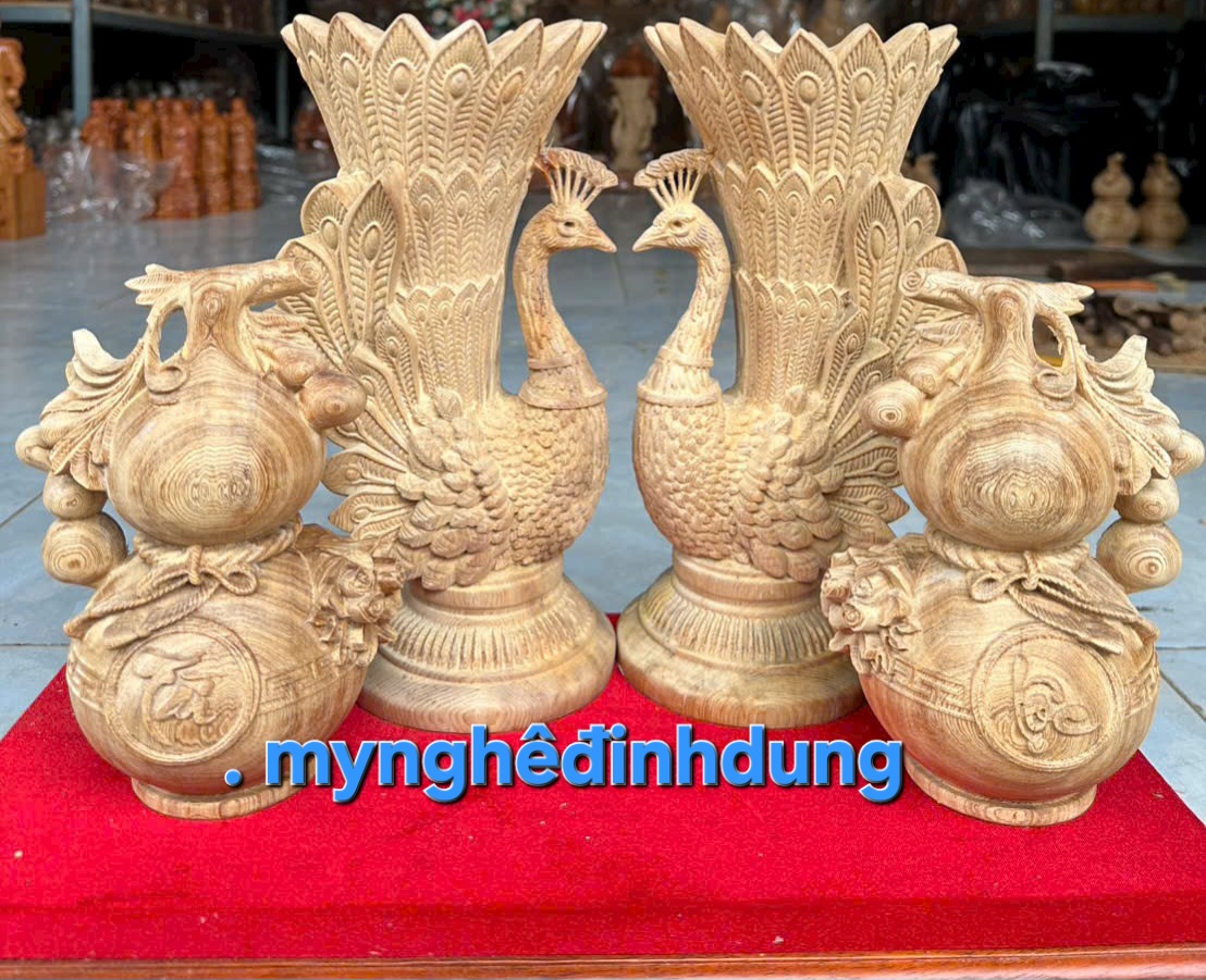 _ Combo cặp chim công cắm hoa và cặp hồ lô phong thủy được làm bằng chất liệu gỗ ngọc Am liền khối tự nhiên 100%